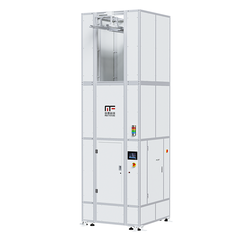 The tower elevator facilitates the placement or lowering of the overhead traveling crane into the track for maintenance using the internal chain. It features a closed design for seamless connection between the OHT track and the ground tooling trolley.